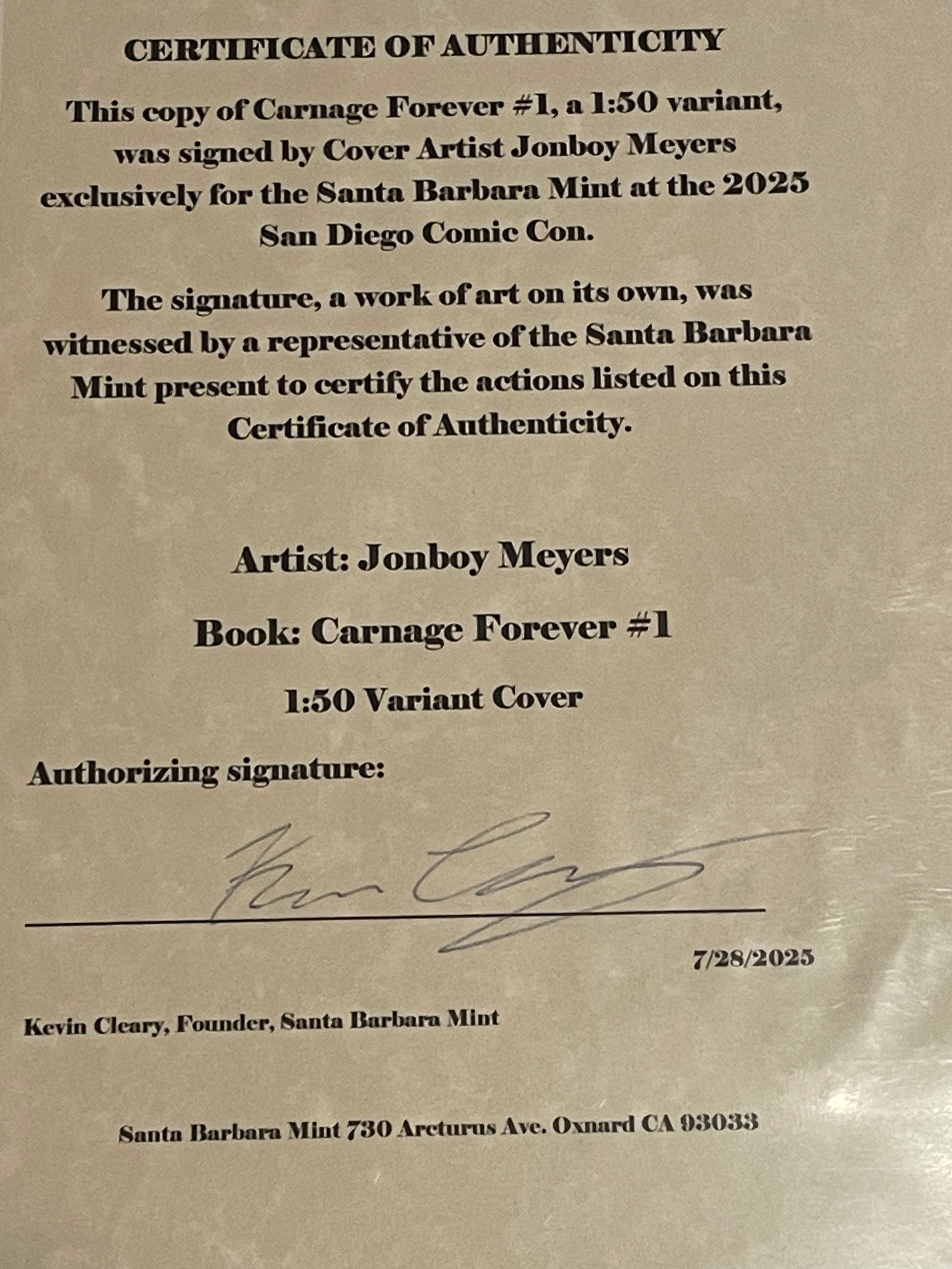 This copy of CARNAGE FOREVER #1, with a 1:50 rare variant cover, was signed by superstar artist Jonboy Myers exclusively for the Santa Barbara Mint at the 2025 San Diego comic con.