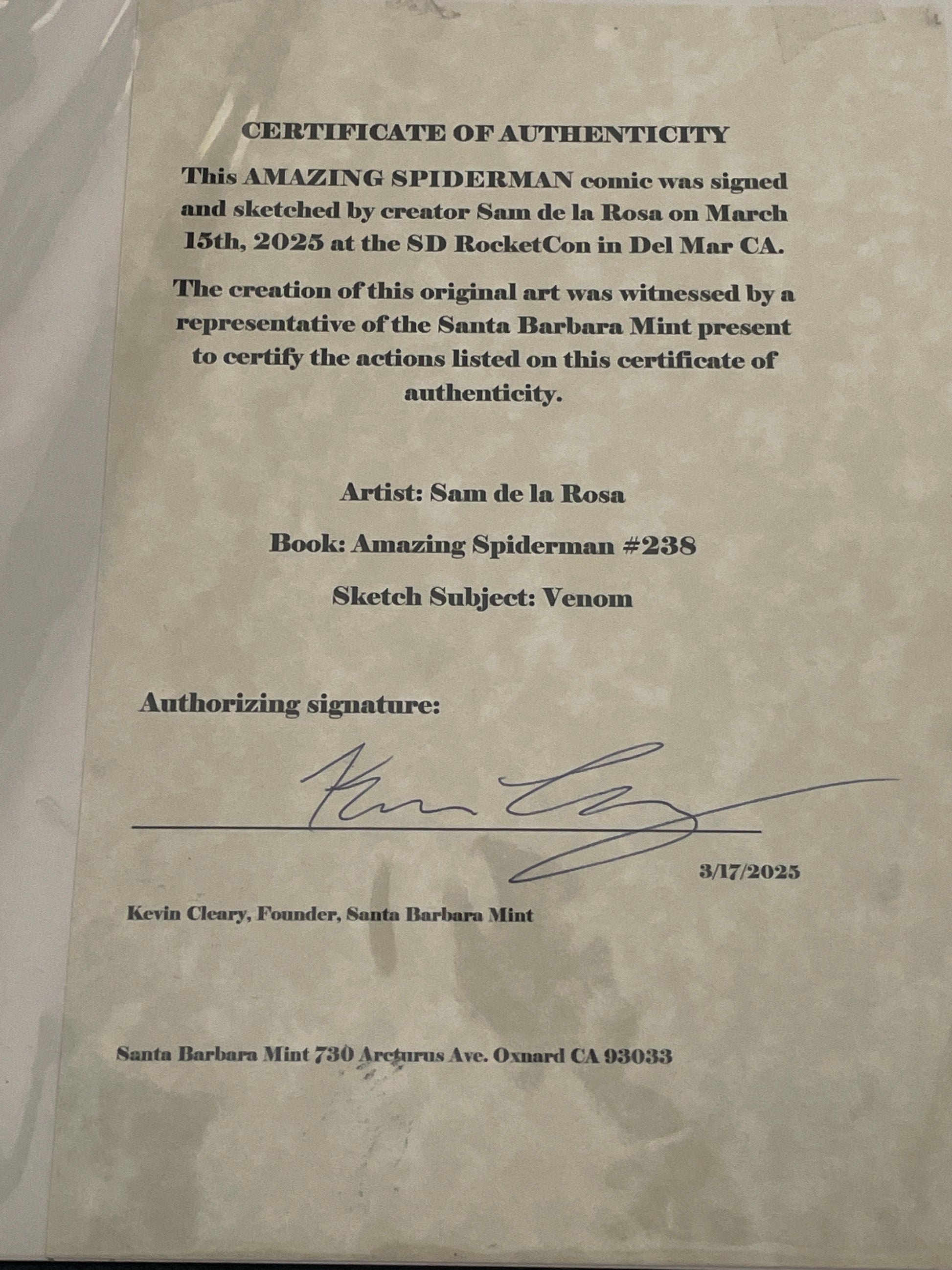 This AMAZING SPIDER-MAN #238 variant cover comic book was signed and sketched by Venom artist Sam de la Rosa on March 15, 2025 at the San Diego RocketCon in Del Mar California.